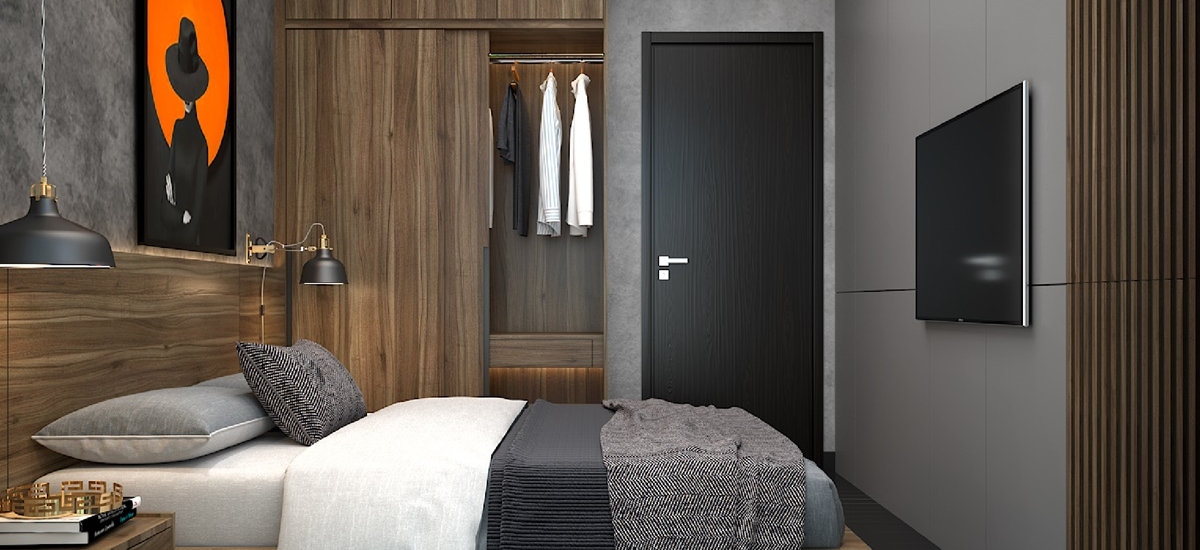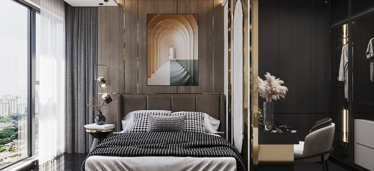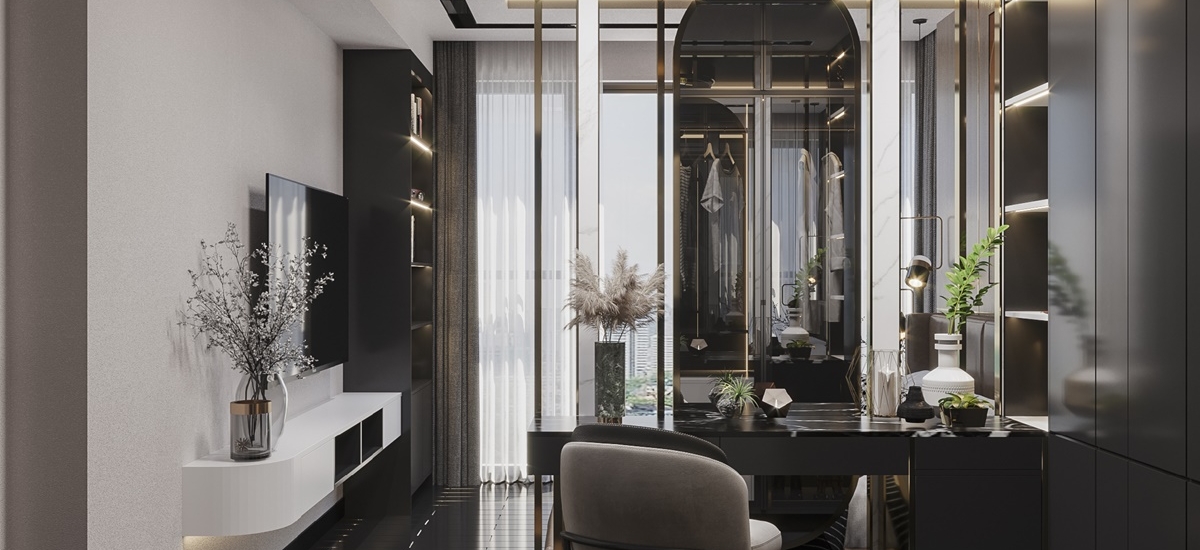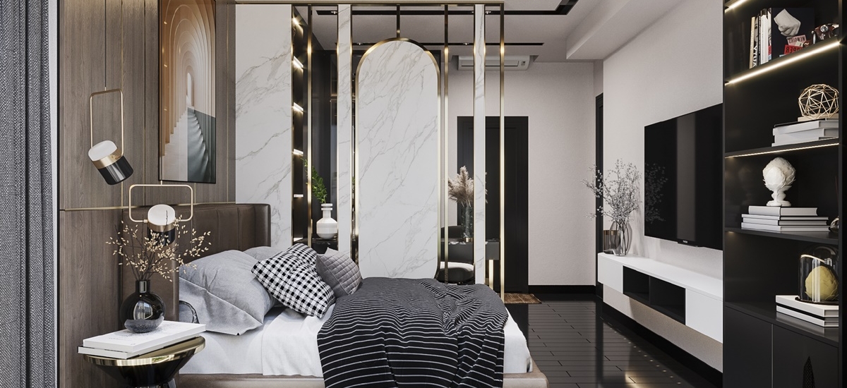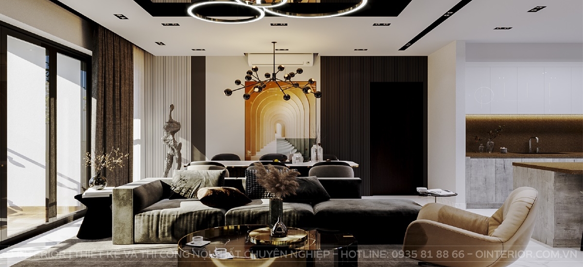 Dựa trên yêu cầu giữ nguyên hiện trạng của sàn gỗ, O Interior đã khéo léo lồng ghép vào những nội thất với chất liệu phù hợp để giúp tổng thể được hài hòa hơn. Căn phòng sẽ được chọn những màu như đen, xám làm tông màu chủ đạo. Bên cạnh đó những chi tiết nhỏ của nội thất như vách ngăn sẽ được dùng chất liệu mạ vàng để làm điểm nhấn đặc biệt cho không gian.