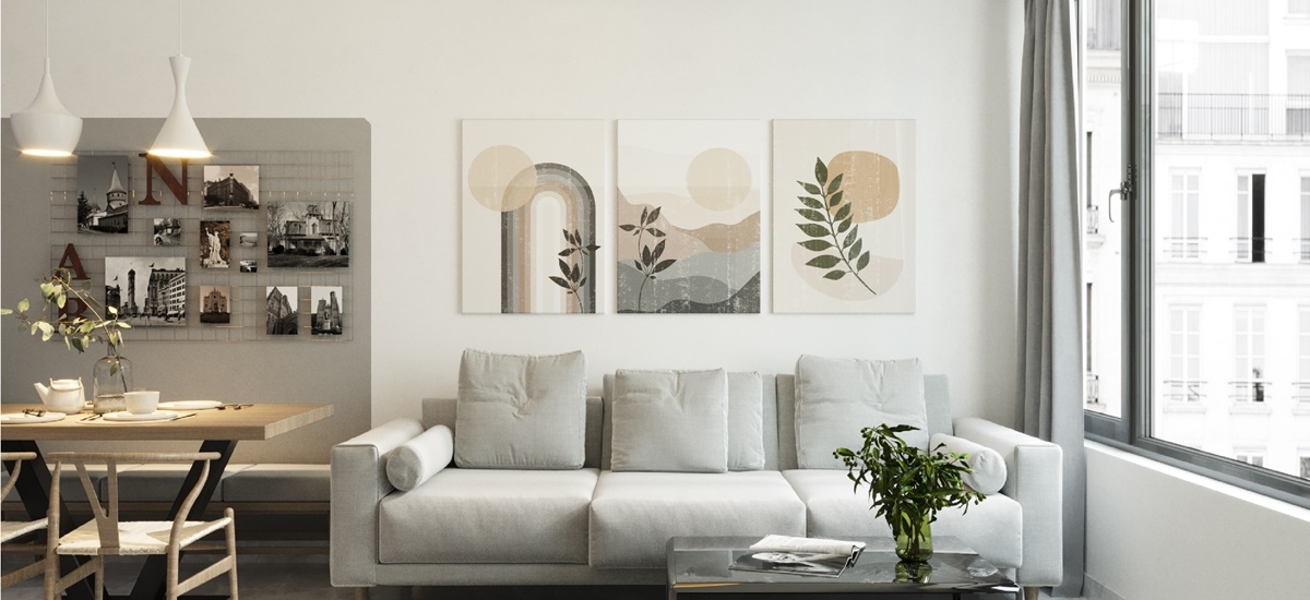 Phòng khách căn hộ River Gate được bài trí đơn giản với bộ sofa xám nhạt trên tông nền trắng của tường. Để tránh tạo sự nhàm chán, KTS đã phối hợp cùng nhiều bức tranh hoạt họa được treo phía sau. Tất cả đem đến sự trẻ trung và thoáng đãng cho cả gian phòng.