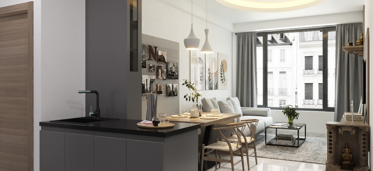 Đối diện đó là đảo bếp nhỏ nhằm phục vụ cho việc chế biến thức ăn và rửa chén, với cách phân chia này có thể giúp chủ nhà thuận tiện hơn trong quá trình nấu nướng của mình.