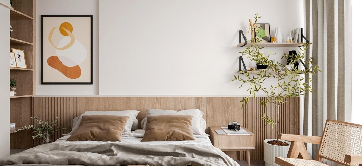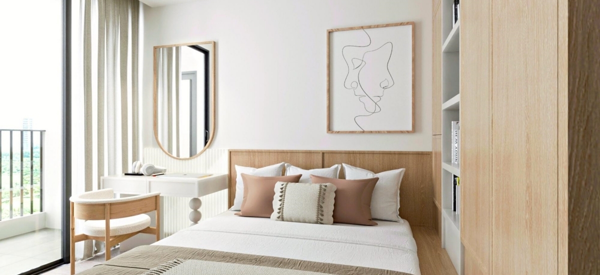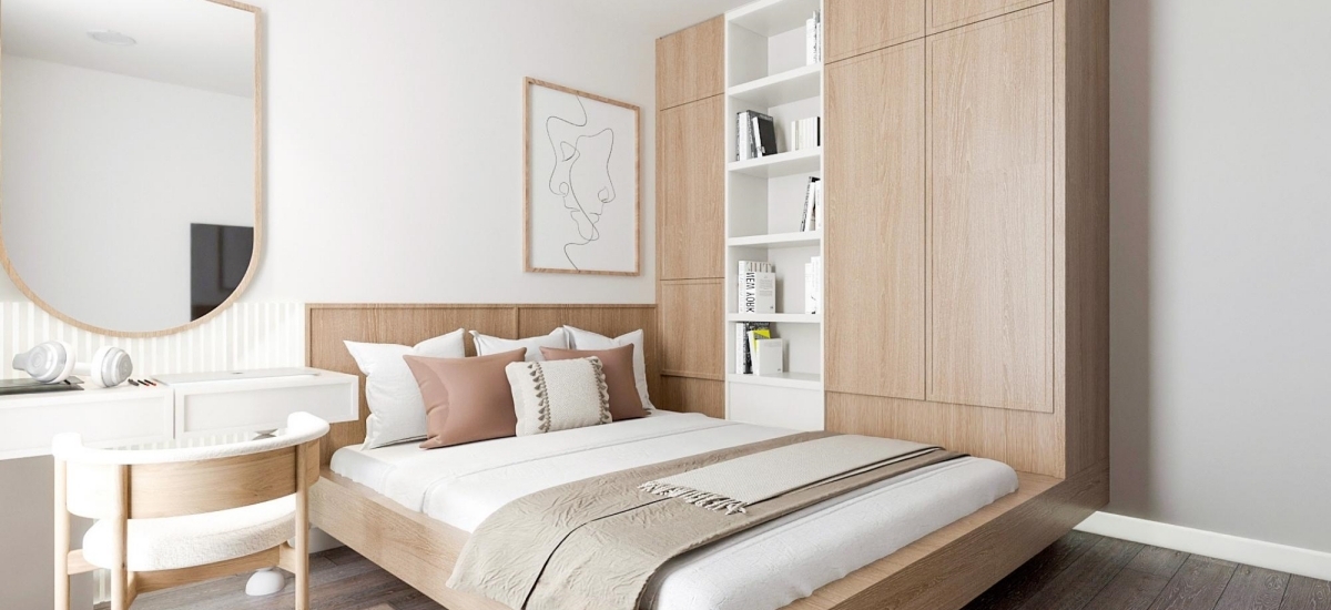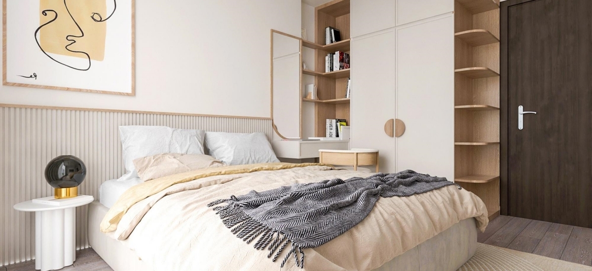 Phòng ngủ nhỏ gọn gàng với hệ tủ được thiết kế liền kề nguyên khối với giường ngủ, giúp tận dụng tối đa diện tích lại còn đảm bảo tính gọn gàng. Kế cạnh đó là bàn trang điểm nhỏ gọn. Tổng thể được phối đồng nhất cùng tone trắng – gỗ, đem đến sự thẩm mỹ cho góc nghỉ ngơi.
