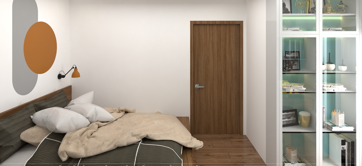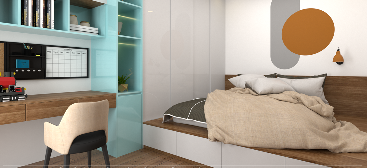 Phòng ngủ thứ 2 được dành riêng cho con nhỏ của gia chủ nên cách sử dụng màu sắc có phần sinh động và tươi vui hơn hẳn. Ngoài góc nghỉ ngơi, tủ lưu trữ thì còn có thêm góc học tập cho bé, dó đó việc sắp xếp cần phải linh hoạt và khéo léo hơn.