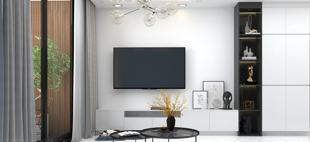 Không cần kệ tủ rườm rà, chỉ với một chiếc sofa, kệ tivi gam trắng với kích thước vừa phải cũng đủ đáp ứng nhiều tiêu chí như đơn giản, tiện nghi và thẩm mỹ.