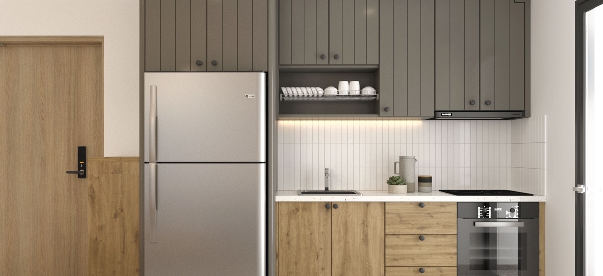 Góc nấu nướng được thiết kế theo dạng chữ I cho phù hợp với diện tích sàn, nhưng vẫn đảm bảo công năng khi sử dụng. Phía trên là hệ tủ chạm trần, giúp mở rộng thêm không gian lưu trữ một cách tối đa. Đặc biệt hơn nữa, với cách làm tủ ốp tủ lạnh đã tạo nên được sự gọn gàng và thẩm mỹ cho góc nấu nướng.