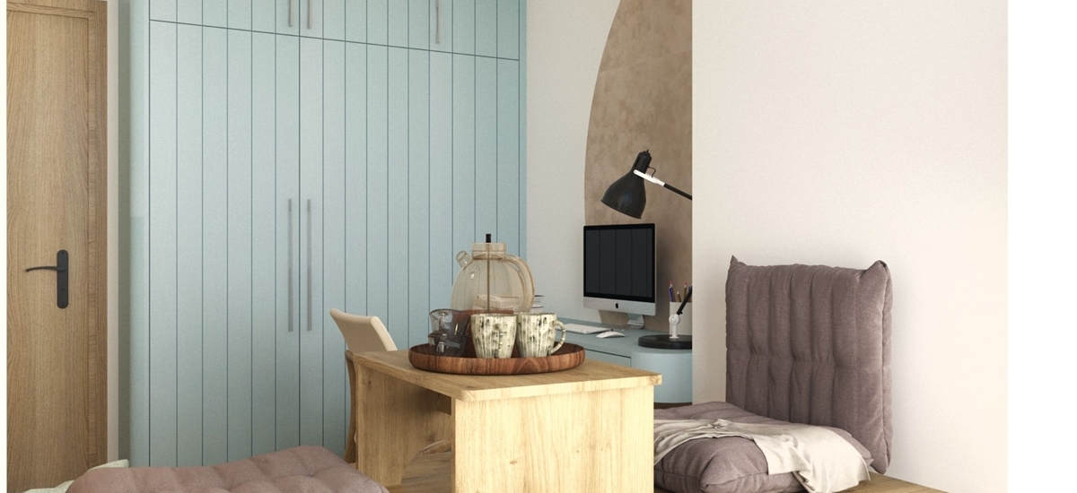 Phòng ngủ nhỏ trước mắt sẽ được trưng dụng cho phòng làm việc và góc dùng trà, đọc sách của gia chủ. Tại đây cũng bố trí các nội thất cơ bản như: bục gỗ, tủ quần áo, bàn làm việc.