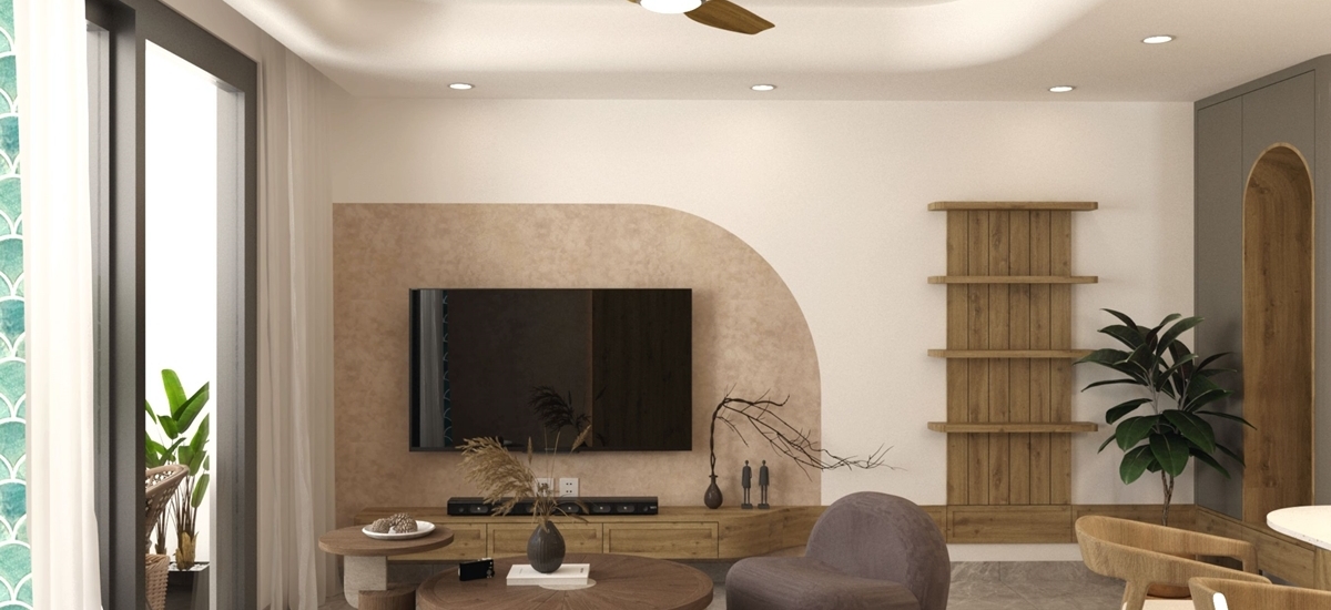 Không gian nơi đây sử dụng nội thất cơ bản với kiểu dáng gọn gàng như: sofa băng, ghế pacha, bàn trà gỗ,…Đối diện là kệ tivi nối dài cùng tủ trang trí. Từng món đồ được sắp xếp đúng vị trí, tạo nên sự hài hòa và tiện nghi khi sử dụng.