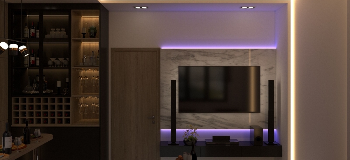 Tiếp đến là khu vực giải trí của gia đình, tại đây sẽ là nơi để cả nhà hát karaoke mỗi lần sum họp. Không gian được thiết kế gần cửa sổ để tận dụng được ánh sáng tự nhiên. Xung quanh gồm có tivi, dàn âm thanh, tủ rượu cùng hệ thống đèn với sắc độ ánh sáng phù hợp.