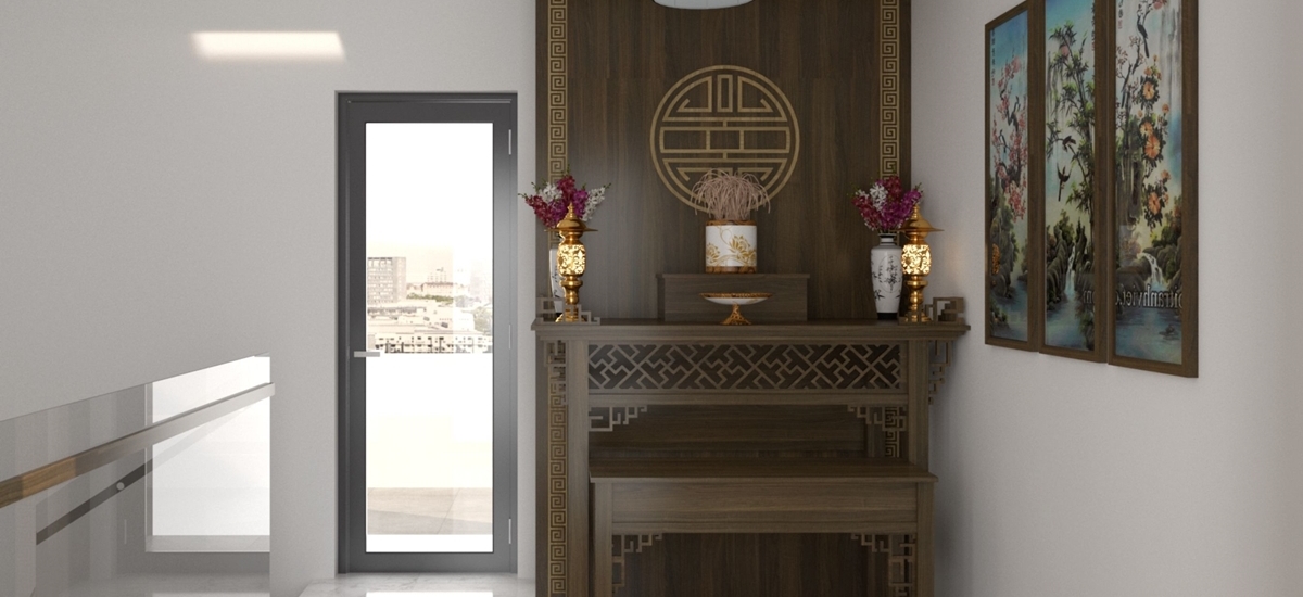Diện tích phòng thờ không quá lớn, vừa đủ để gia đình thuận tiện cúng bái. Song song đó, KTS đã sử dụng chất liệu gỗ tự nhiên kết hợp cùng hoa văn cổ kính cho tủ thờ. Nhờ đó làm tăng sự trịnh trọng và trang nghiêm cho không gian thờ cúng.