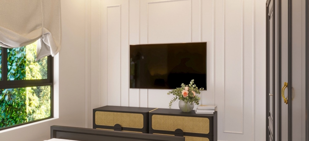 Phòng ngủ Master là sự kết hợp linh hoạt giữa nét đẹp cổ điển, tinh túy của phong cách Đông Dương cùng tính công năng, tiện nghi từ phong cách hiện đại. Chúng được thể hiện qua những yếu tố như: tranh vẽ, họa tiết ở ghế, tủ quần áo và kệ tủ tivi với chất liệu gỗ, mây tre. Không gian nơi đây tuy được ưu ái về diện tích, nhưng KTS vẫn tiết chế bớt các món nội thất hay họa tiết không cần thiết để tránh tạo cảm giác tù túng.