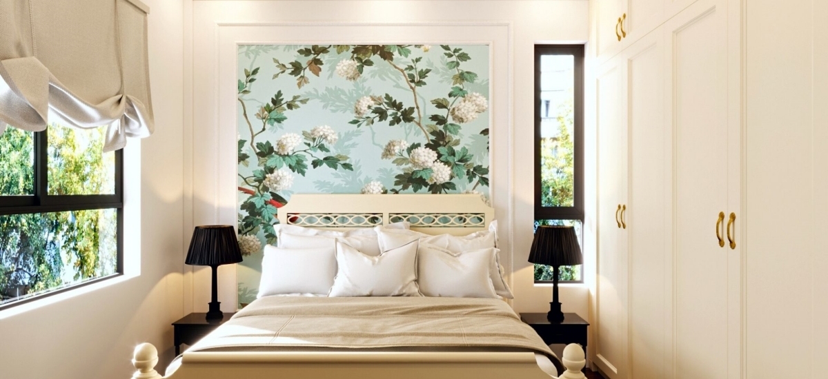 Phòng ngủ nhỏ toát lên vẻ đẹp đầy hoài niệm, mộc mạc. Không cần quá nhiều họa tiết rườm rà, KTS chỉ phối tường cùng các đường phào chỉ trắng, giường tone màu gỗ và bức tranh hoa vàng đất. Chỉ đơn giản thế thôi cũng đủ để không gian thể hiện rõ nét tinh thần Đông Dương truyền thống.